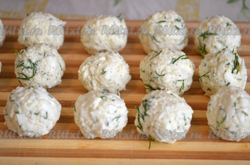 Из получившейся сырной массы влажными руками скатать небольшие шарики. Если вы готовите их часа за 3-4 до подачи, то в таком виде отправьте их в холодильник.