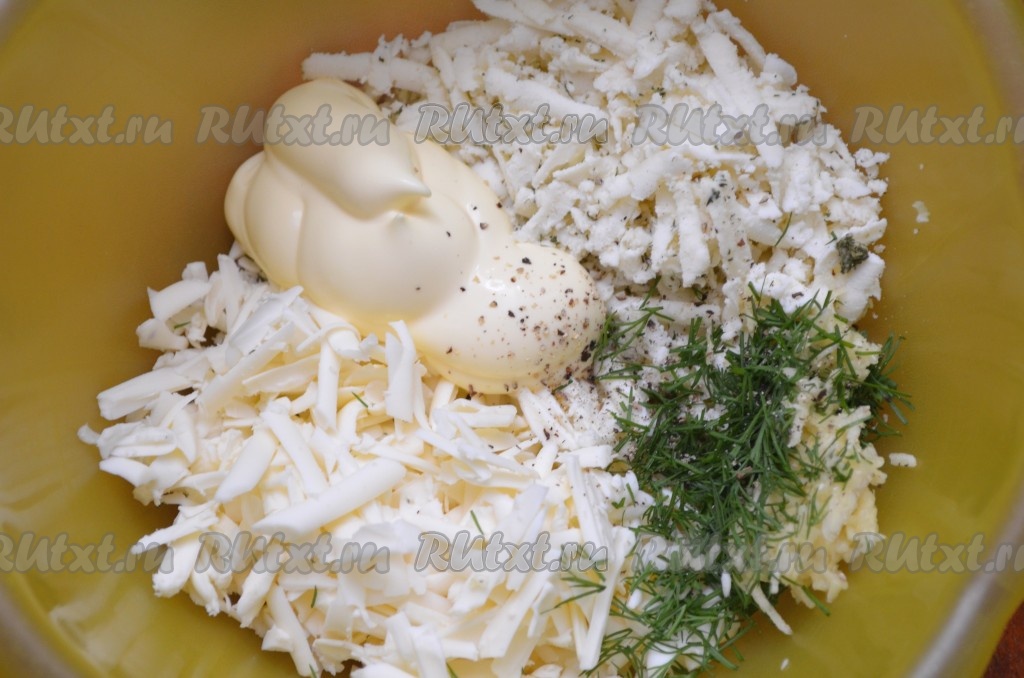 Сложить в миску натёртые сыры, укроп и чеснок, посолить, поперчить, добавить 2 столовых ложки майонеза, перемешать. Сырная масса должна получиться достаточно густой, пластичной, хорошо держащей форму. Она не должна быть жидкой, но и суховатой она быть не должна. При необходимости можно добавить ещё немного майонеза.