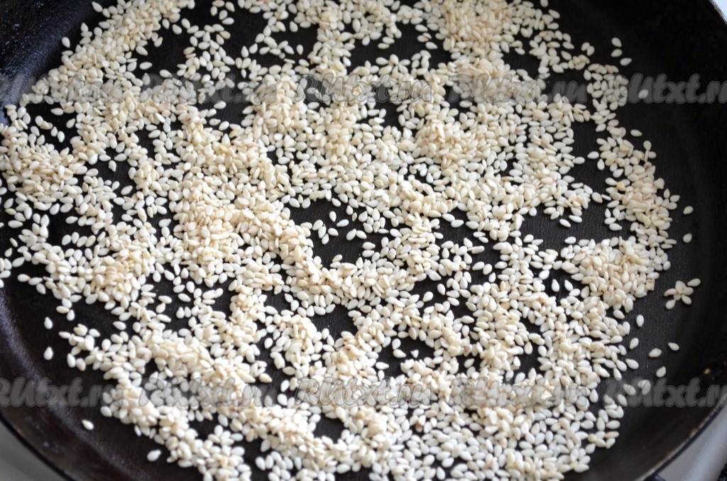 Кунжут поджарить на сухой сковороде на среднем огне, помешивая, до золотистого цвета. Обжаренному кунжуту дать остыть.