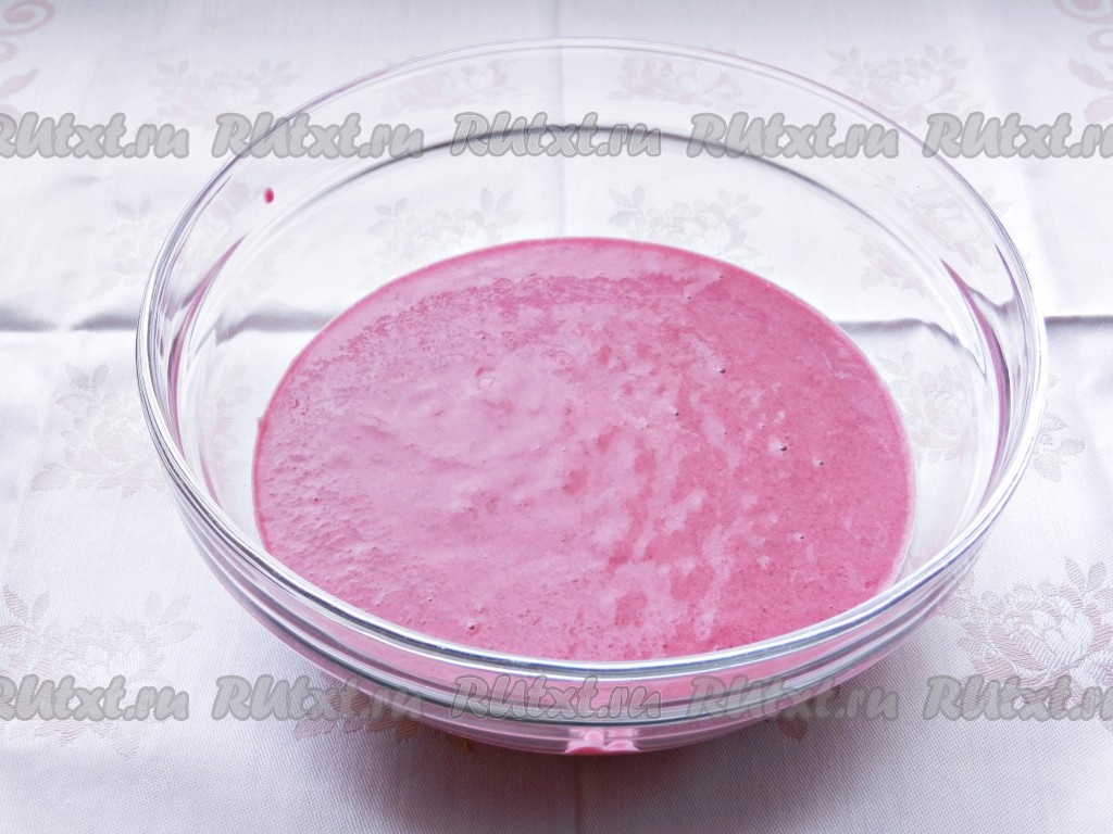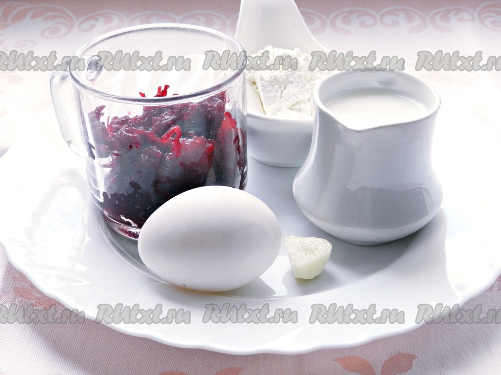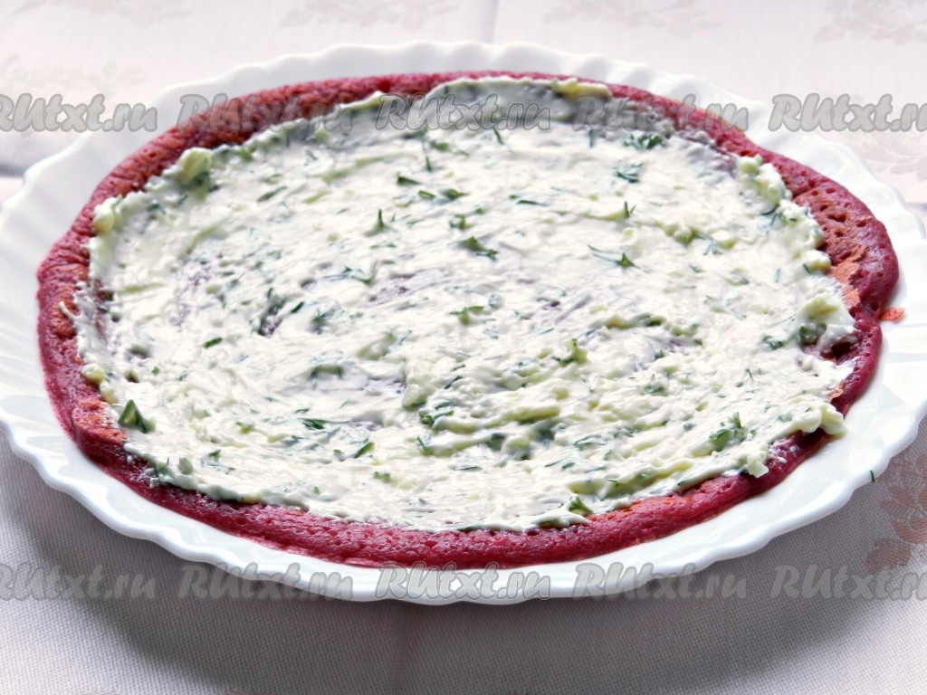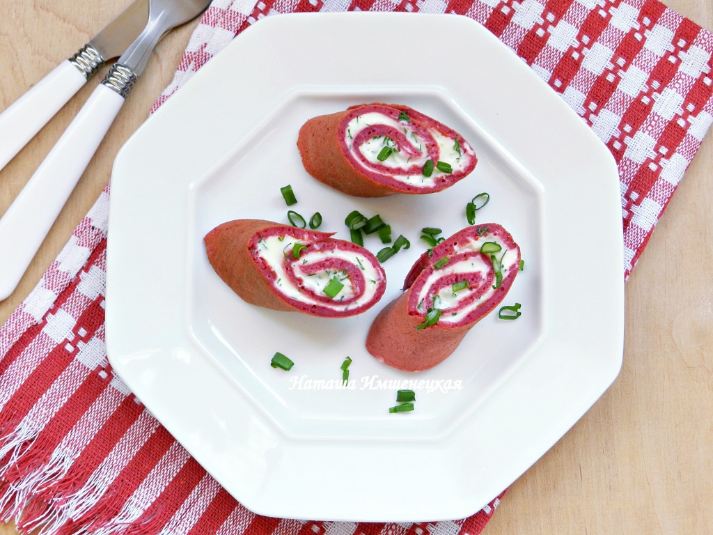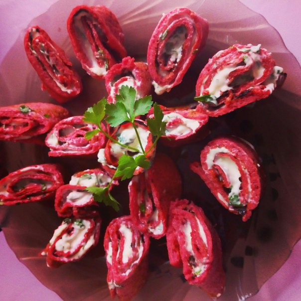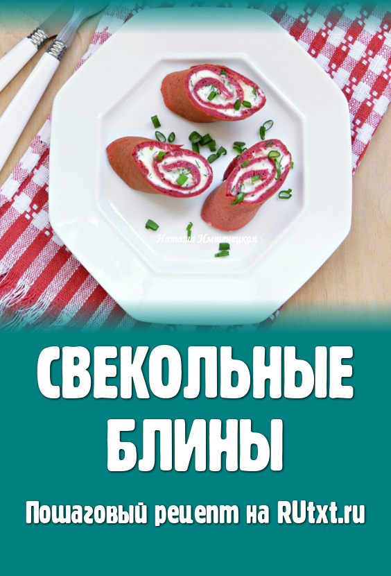 При подаче свекольные блины нарезать наискосок (шириной 2 см). Блюдо получается необычным и вкусным.