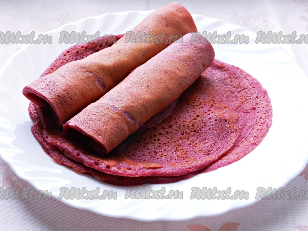 Оригинальные по внешнему виду и вкусу блины можно приготовить из свеклы. Свекольные блины получаются эластичными, хорошо сворачиваются в рулетики. Начинку можно подобрать по своему вкусу, только не слишком влажную.