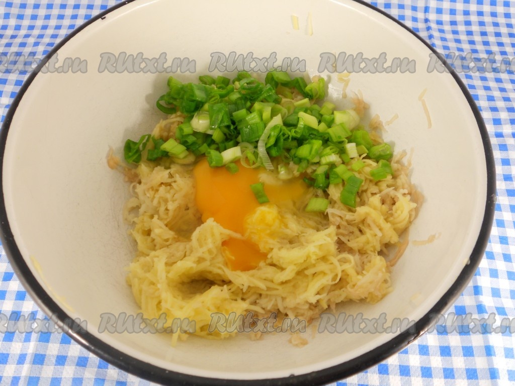 К натёртому картофелю добавить сырое яйцо, мелко нарезанный зелёный лук (или другую свежую зелень). Если вы возьмёте крупное яйцо, тогда достаточно будет 1 яйца. Если яйцо мелкое, тогда нужно добавить 2 штуки.