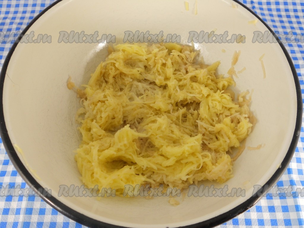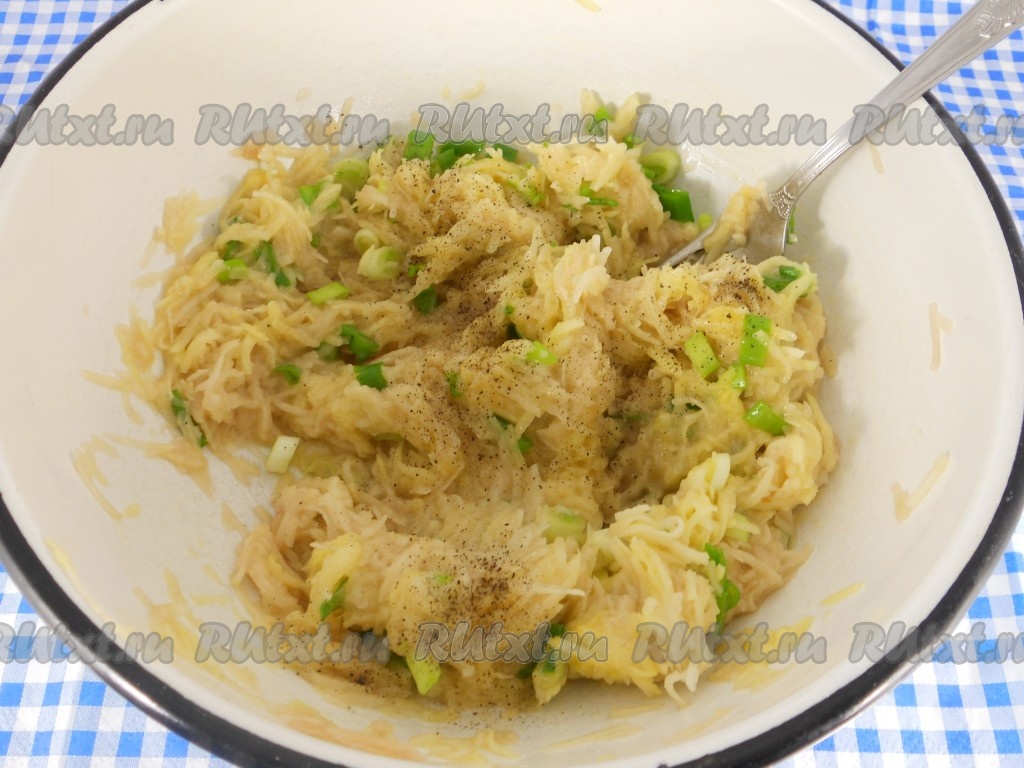 Зелёный лук (или другую свежую зелень) вымыть, обсушить немного. Картофель очистить и натереть на мелкой тёрке в глубокую миску, посолить.