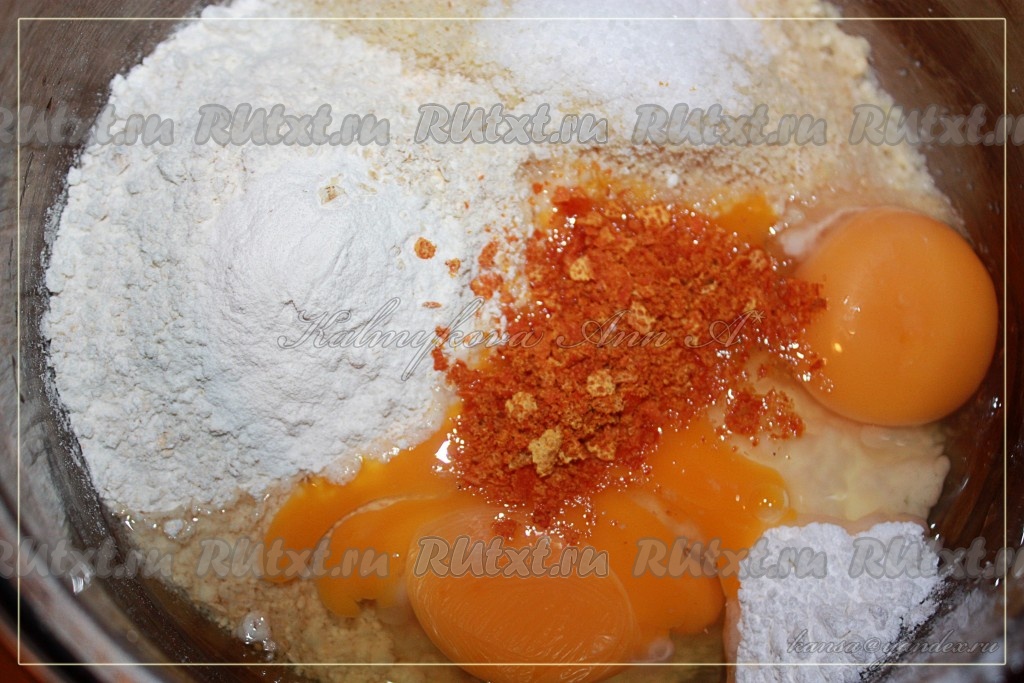 Смешать молотый миндаль, измельченные овсяные хлопья, яйца, муку, разрыхлитель, соль, цедру апельсина и 100 грамм сахарной пудрой.