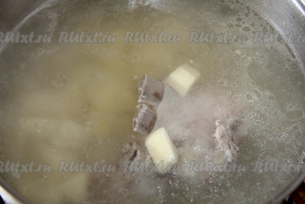 Очищенный картофель нарезаем кубиками и отправляем в мясной бульон. Провариваем 5 минут.