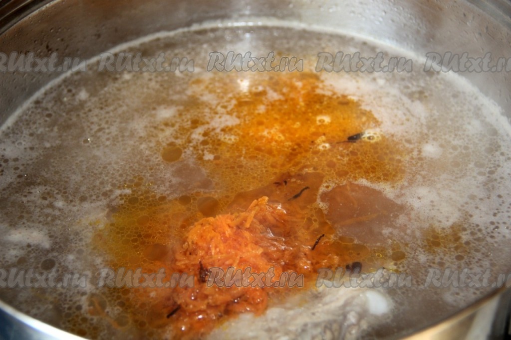 Отдельно обжариваем лук вместе с морковью. Когда гречка и картофель в супе почти готовы, добавляем обжаренные лук и морковь.