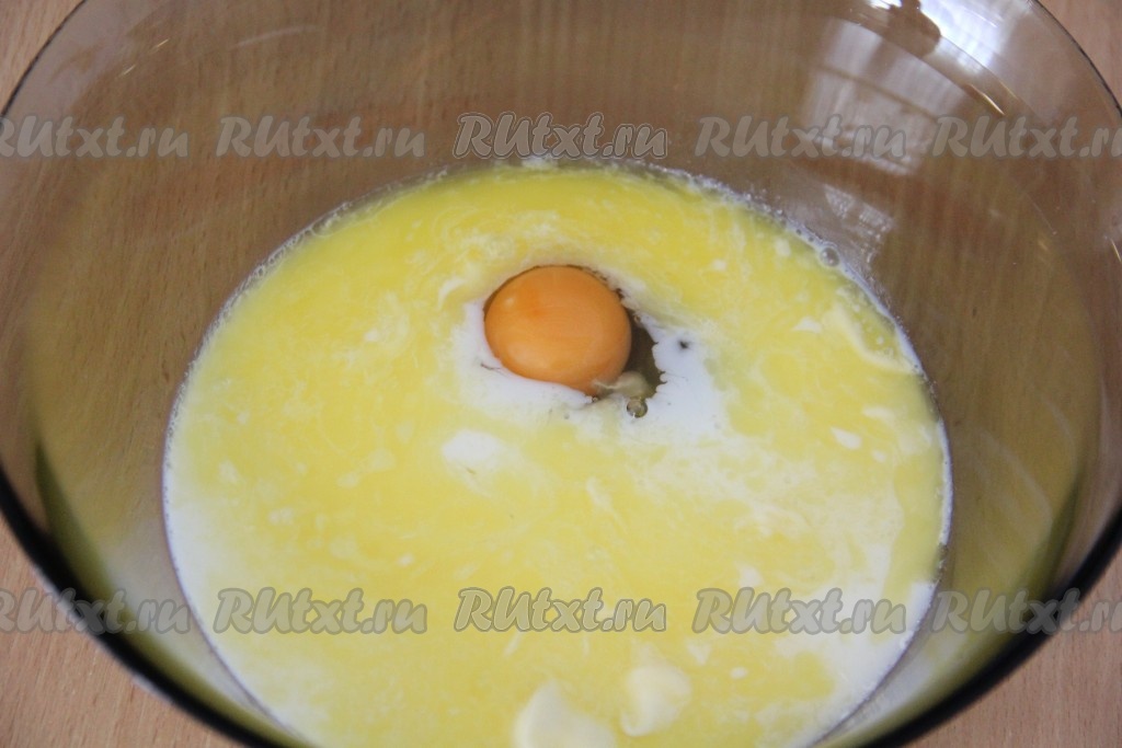 Масло растопить и остудить. В глубокую миску влить молоко, добавить яйцо и растопленное масло.