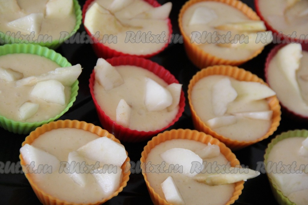 Разложить тесто по формочкам, заполняя их на 1/2 объёма. Я использовала силиконовые формочки. Выложить кусочки груши поверх теста и слегка утопить их в тесто. Духовку заранее разогреть до 180 градусов.