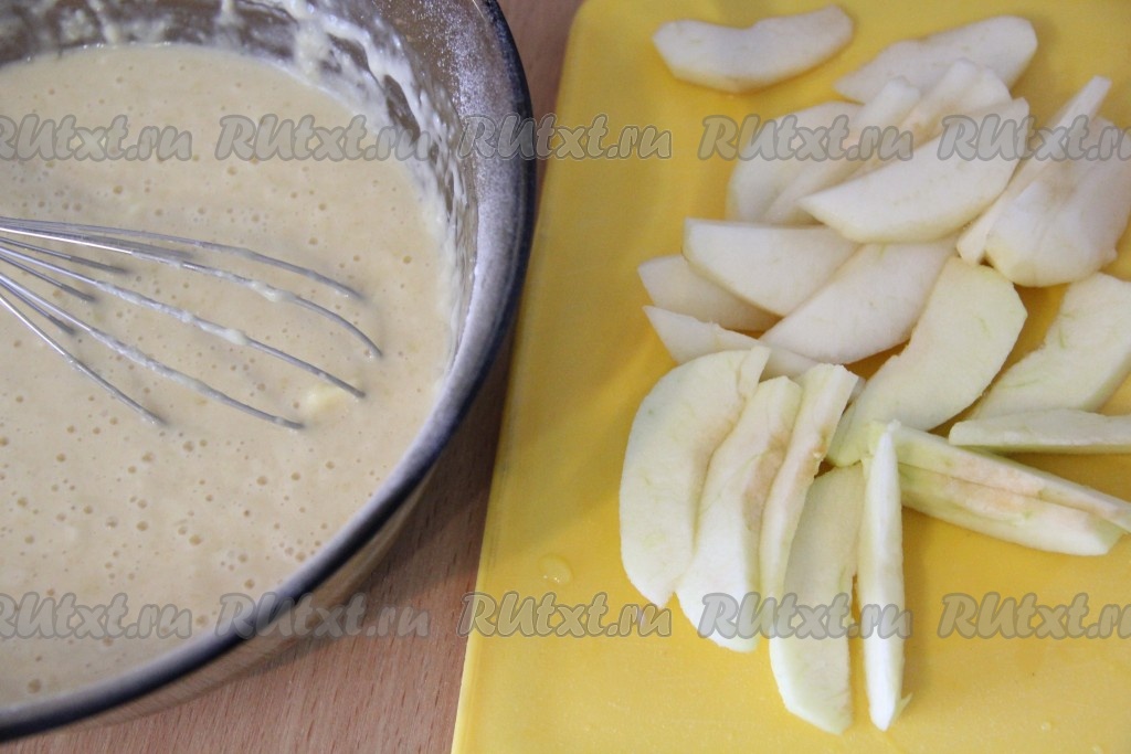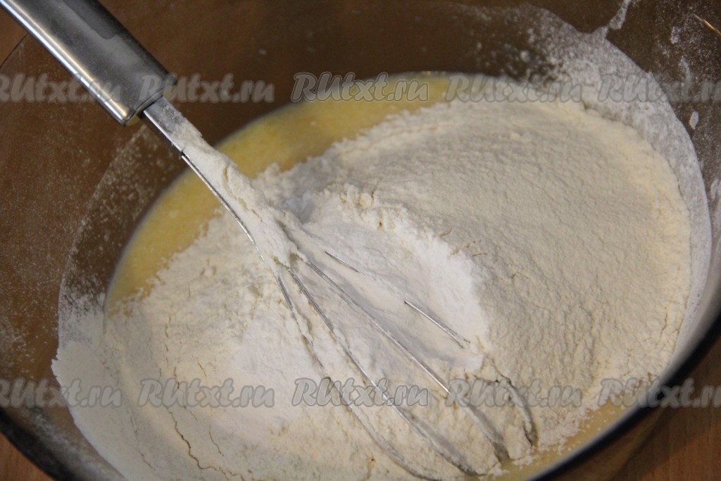 Далее всыпать просеянную муку и разрыхлитель. Всё перемешать до однородности. Консистенция теста должна быть не густой, слегка комковатой.
