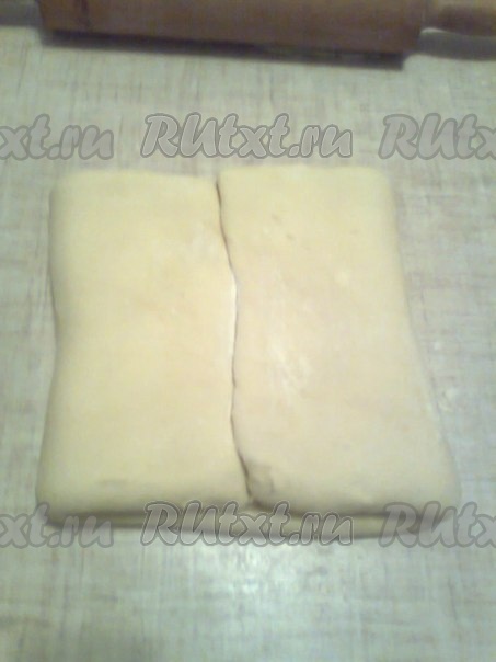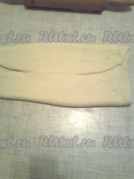 Тесто перевернуть и раскатать до первоначального размера в виде квадрата или прямоугольника