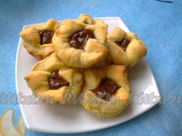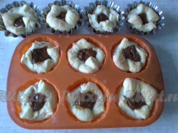 Если формочек нет, можно связать мешочки ниткой, но не сильно, чтоб в середине осталось отверстие. Выпекать в разогретой духовке при 200-220 градусах 25-35 минут (ориентируйтесь на свою духовку). Готовые слойки остудить в формах.