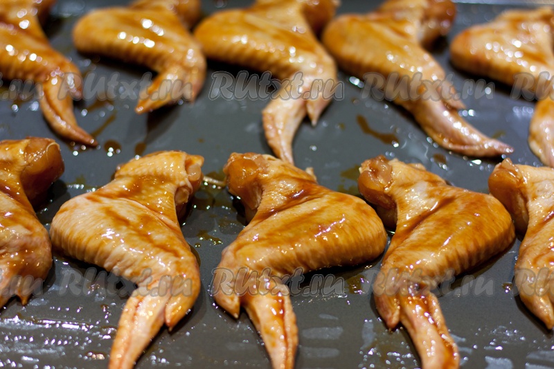 Выложите маринованные крылья на противень, смазанный растительным маслом.