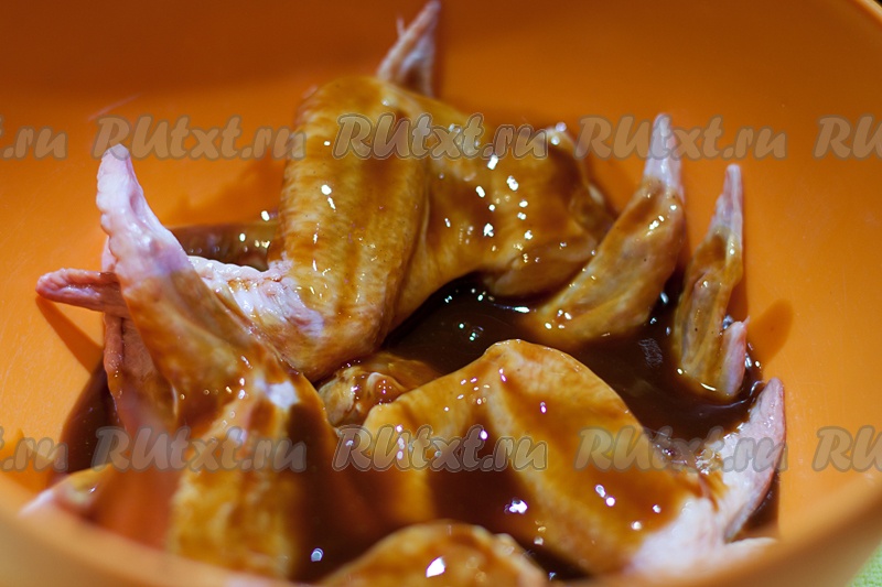 Замаринуйте куриные крылья минут на 10-15 в смеси кетчупа и соевого соуса.