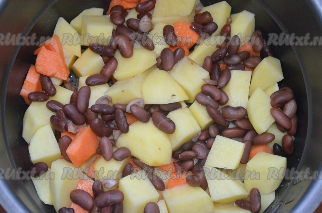В чашу мультиварки сложить картошку, морковь, отваренную  фасоль без жидкости, посолить.