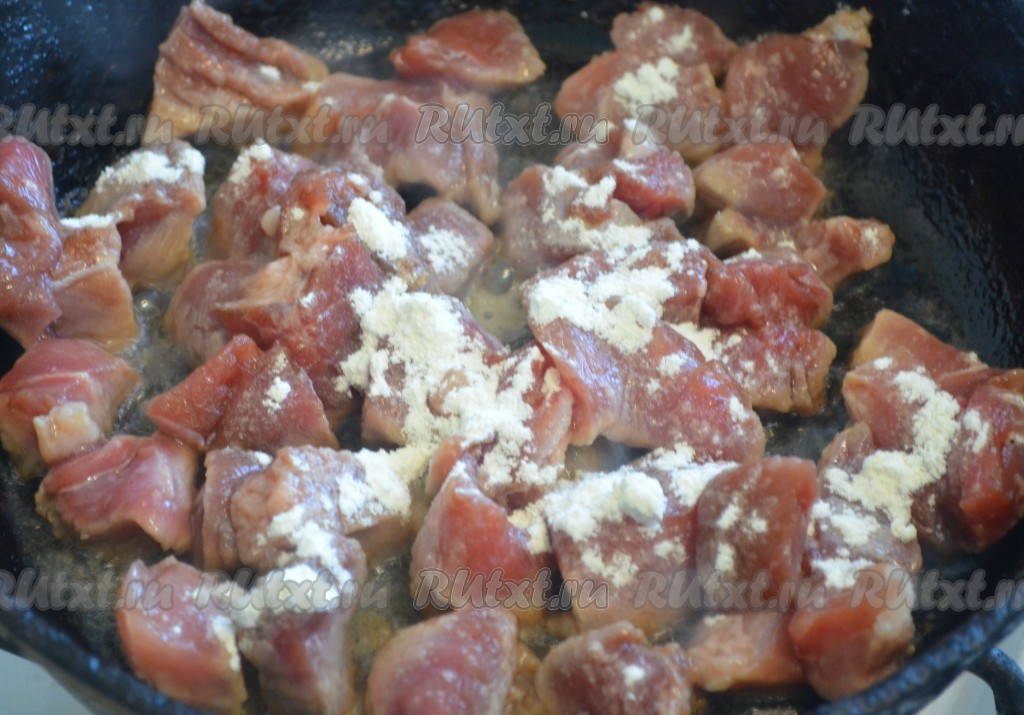 Разогреть в сковороде масло, выложить мясо, посыпать мукой, перемешать. Жарить, помешивая, на среднем огне до золотистой корочки.