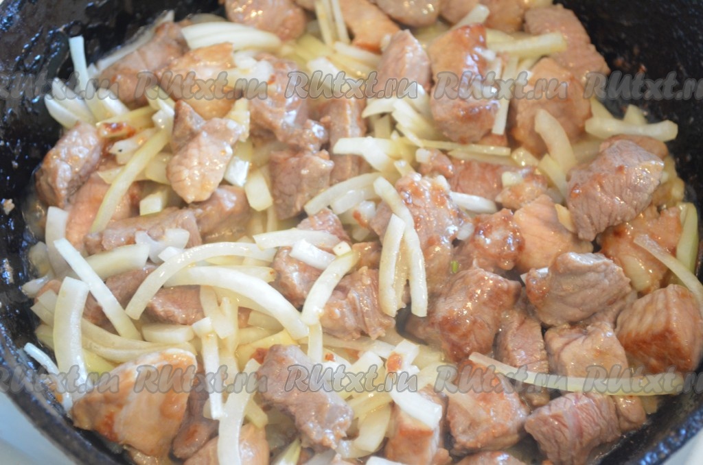 Затем добавить лук, перемешать, обжарить немного, помешивая.