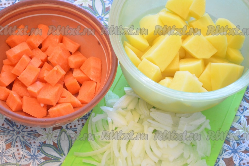 В чашу мультиварки сложить картошку, морковь, фасоль без жидкости, посолить.