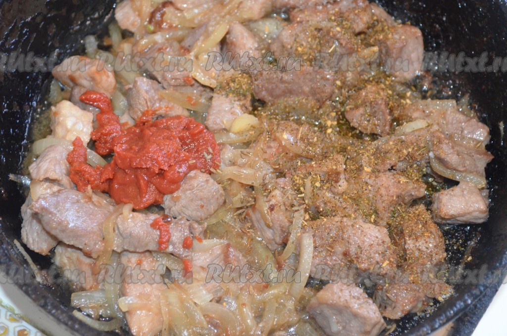 Добавить томатную пасту, соль, сахар, специи, перемешать, огонь выключить.