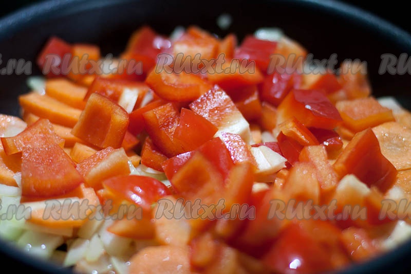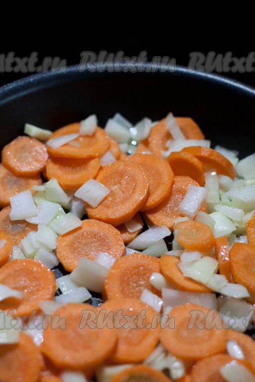Разогреть растительное масло на сковороде и выложить в нее нарезанные овощи (лук и чеснок - помельче, морковь - кружками). Обжарить до золотистого цвета.