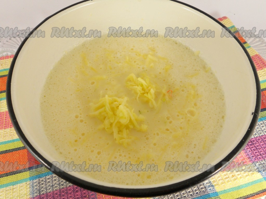 Продолжая взбивать, влить в яичную смесь молоко комнатной температуры. Добавить очищенное и натёртое на средней тёрке яблоко, перемешать.