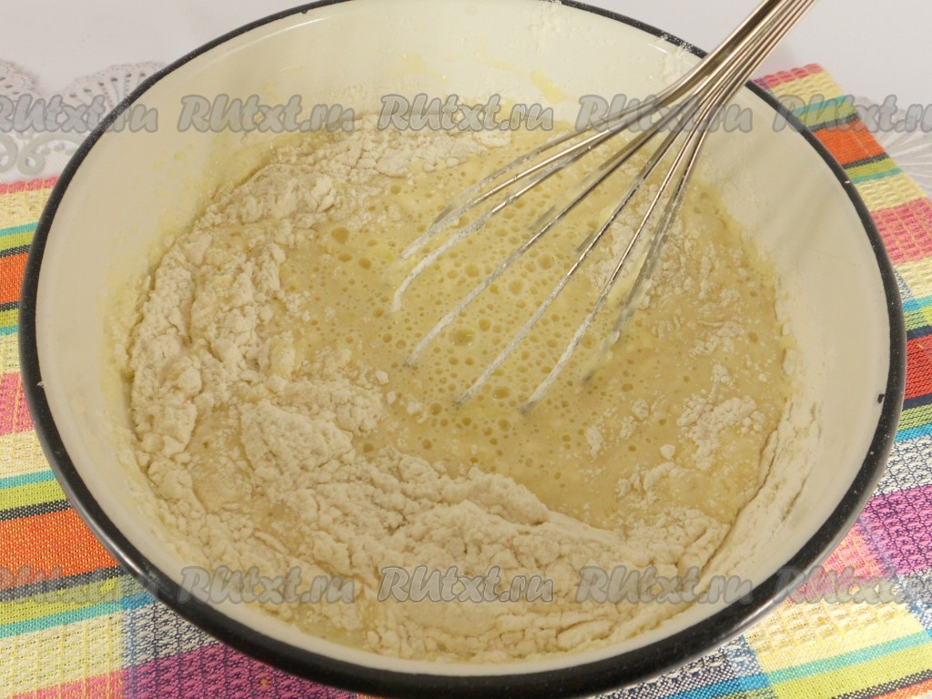 Тщательно перемешать, тесто не должно быть слишком жидким, но и не должно быть густым, поэтому всыпайте муку частями, её может понадобиться больше или меньше. Затем добавить разрыхлитель, перемешать и оставить тесто на 20 минут.