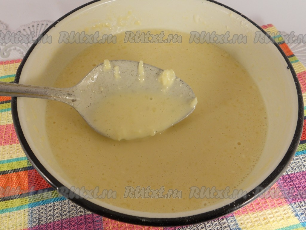 Влить тёплое растопленное сливочное масло, всыпать просеянную муку.
