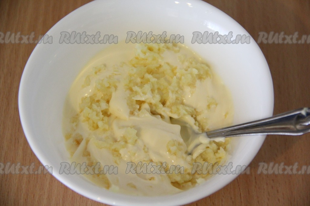 Чеснок почистить и пропустить через пресс. Соединить майонез с чесноком и хорошо перемешать.