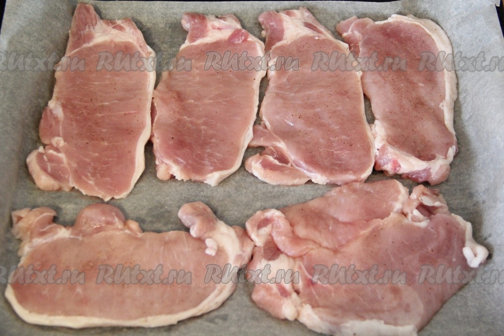 Свинину порезать на порционные кусочки, не тонко. Слегка отбить кусочки свинины. Посолить и поперчить по вкусу. Противень для запекания выстелить пергаментом. Выложить кусочки свинины на пергамент.