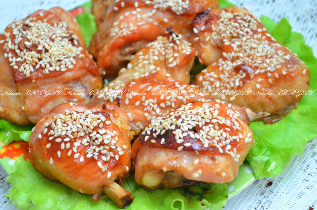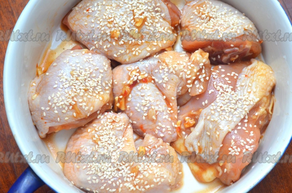 Выложить курочку в жаропрочную форму, посыпать кунжутом. Поставить форму в разогретую духовку на 40 минут при температуре 200 градусов.