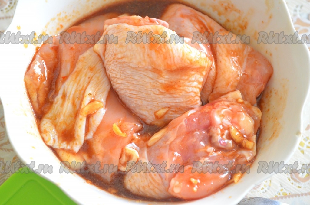 Замариновать курицу и оставить при комнатной температуре на 2 часа (можно на ночь).