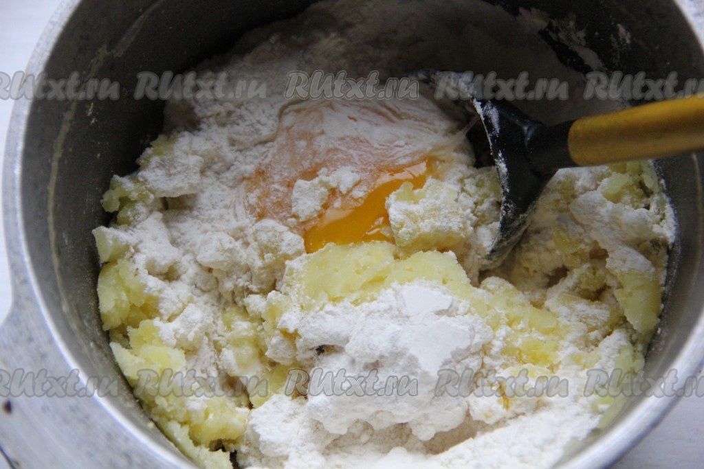 Для приготовления картофельных клецок заранее отвариваем очищенную картошку в подсоленной воде до готовности (в течение минут 25 с момента закипания воды), затем воду сливаем. Разминаем картофель до однородности, даём получившемуся пюре остыть, затем добавляем яйцо и 1 столовую ложку муки, тщательно перемешиваем. Затем добавляя по 1 столовой ложке оставшейся муки и полностью вмешивая её, замешиваем картофельное тесто. Добавляя муку, учитывайте, что тесто должно получиться достаточно мягким, в меру густым, оно не должно быть жидким, но и в ком оно собираться не должно.
