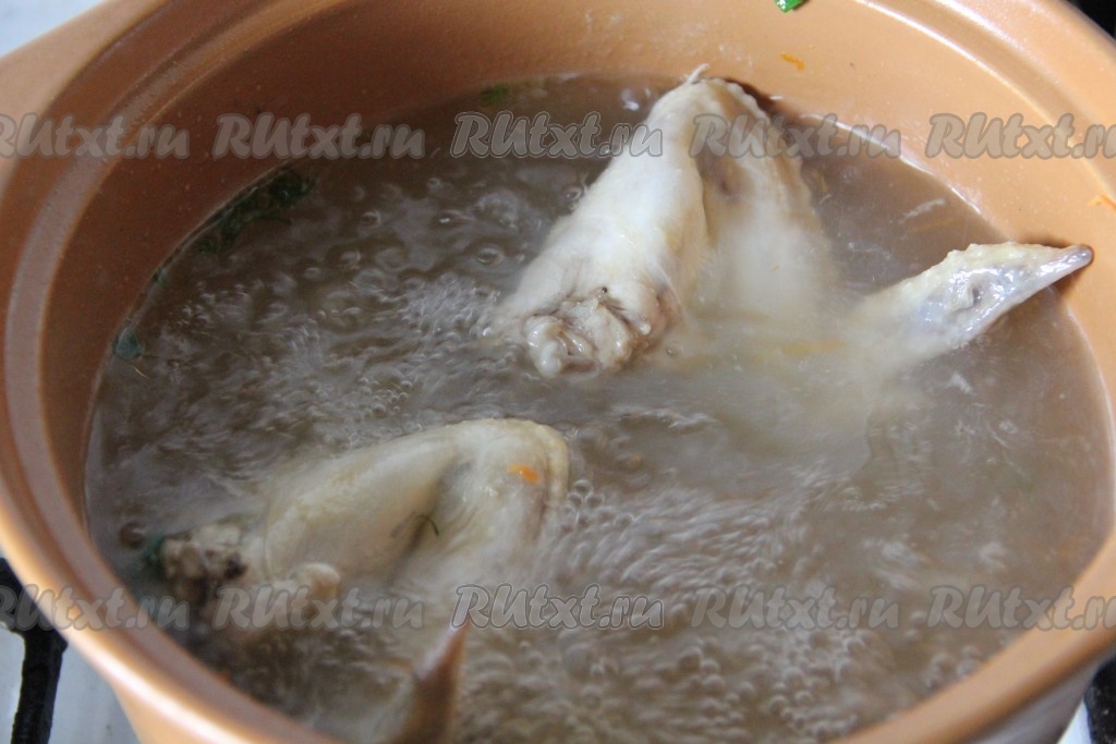 Моем части курицы, перекладываем в кастрюлю, заливаем 2,5-3 литрами холодной воды и ставим на огонь. После того как вода закипит, убираем пену и варим бульон на небольшом огне 25 минут. По истечении времени вынимаем мясо из бульона, отделяем от костей. Бульон ставим на огонь и доводим до кипения.