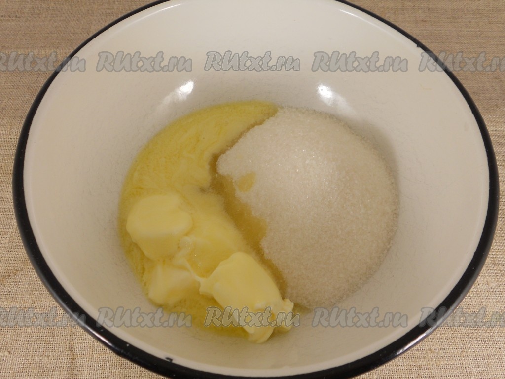 Сливочное масло заранее достать из холодильника, чтобы оно размягчилось и стало достаточно мягким. После того как масло согреется до комнатной температуры и станет мягким, переложить его в ёмкость, в которой будет удобно взбивать миксером, всыпать сахар.