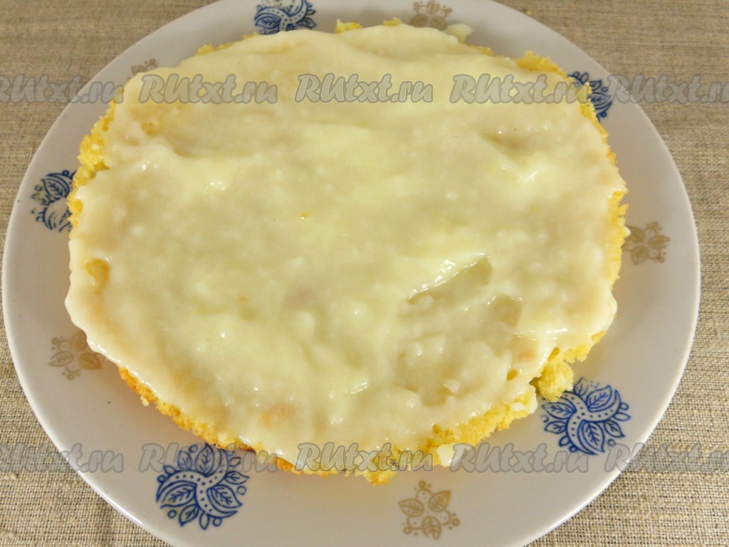 Остывший бисквит аккуратно разрезать на 2 части (у нас получатся 2 коржа). Обильно смазать заварным кремом нижнюю часть, сверху накрыть второй частью коржа.
