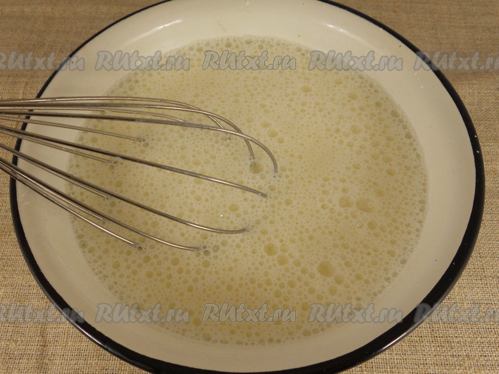 Влить молоко и хорошенько перемешать венчиком.