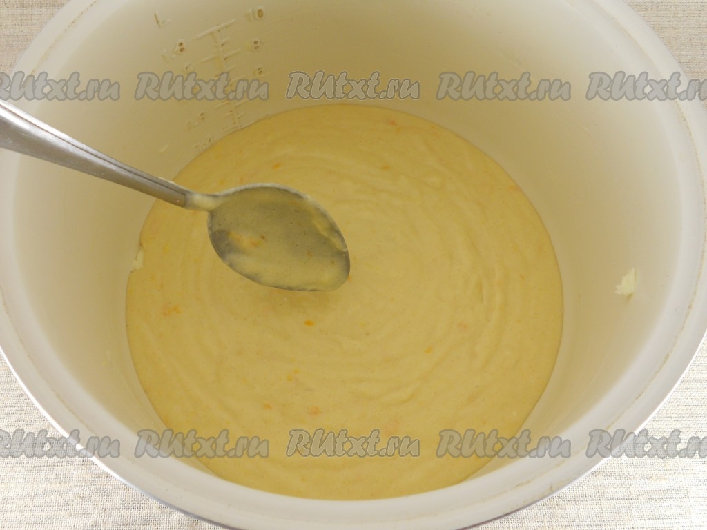 Чашу мультиварки хорошо смазать сливочным маслом. Из пергаментной бумаги вырезать круг по диаметру дна чаши мультиварки. На дно чаши поместить круг из бумаги, вылить тесто в чашу, разровнять, крышку мультиварки закрыть.
