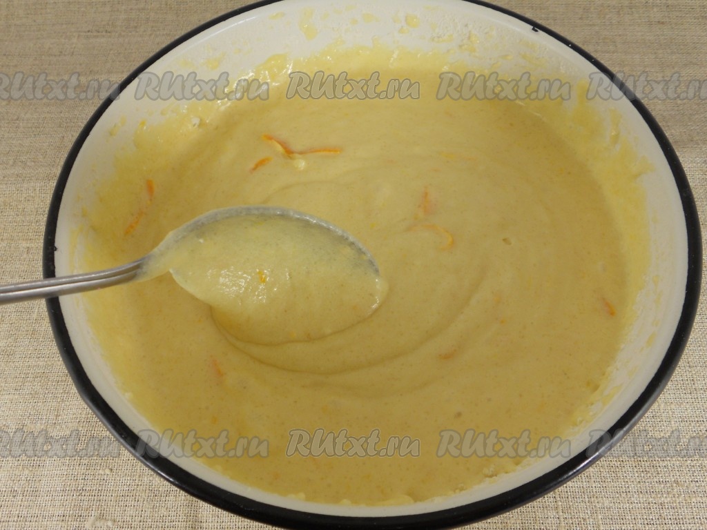 Взбить миксером сахар с маслом до однородности, затем добавить яйца и молоко. Тщательно взбить миксером до однородности. Часть муки вместе с разрыхлителем просеять в получившуюся жидкую смесь, перемешать миксером. Частями добавляя оставшуюся просеянную муку и вмешивая её на низких оборотах миксера, замесить однородное, в меру густое тесто, напоминающее сметану средней жирности, как на фото. Муки может понадобиться чуть больше или чуть меньше, главное - ориентироваться на консистенцию замешиваемого теста. При желании, в тесто можно добавить совсем немного цедры апельсина или лимона, перемешать.