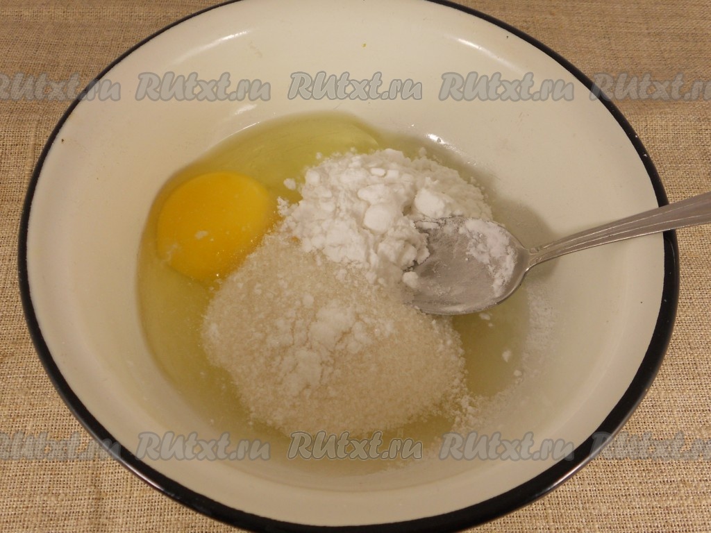 Пока бисквит остывает, приготовим заварной крем. Для этого в посуду, в которой будете варить крем, нужно вбить сырое яйцо, всыпать сахар и крахмал, тщательно перемешать столовой ложкой.