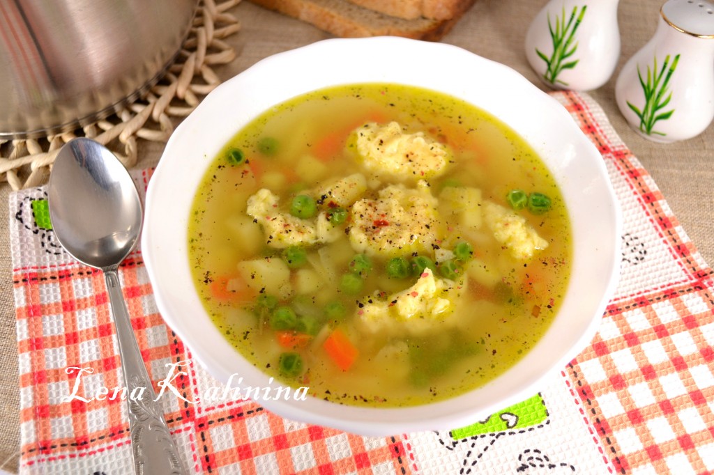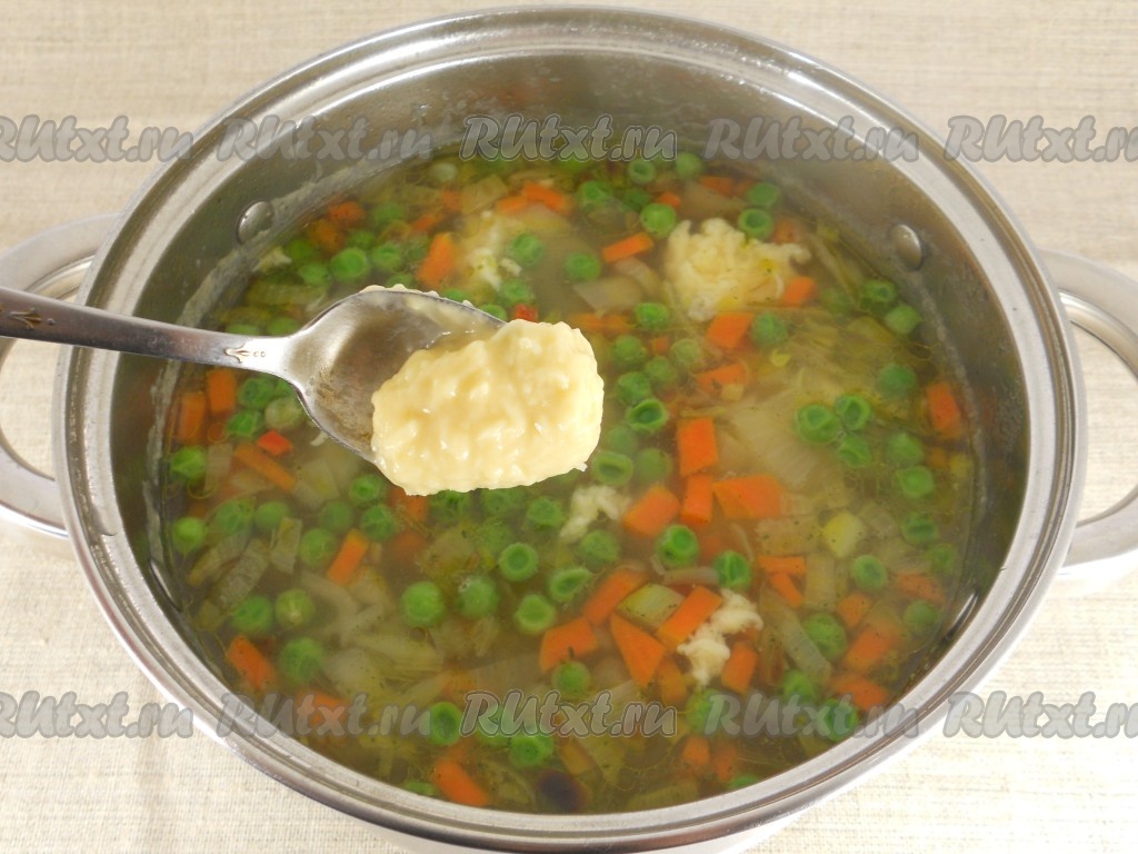 После того как суп с горошком и овощами проварится 7 минут, добавить специи (я всыпала приправу для супа и свежемолотую смесь перцев), дать супу закипеть. В закипевший суп окунуть вначале чистую чайную ложку (это нужно для того, чтобы тесто в дальнейшем лучше отделялось от ложки), а затем этой ложкой набирать понемногу сырного теста и отправлять в суп.