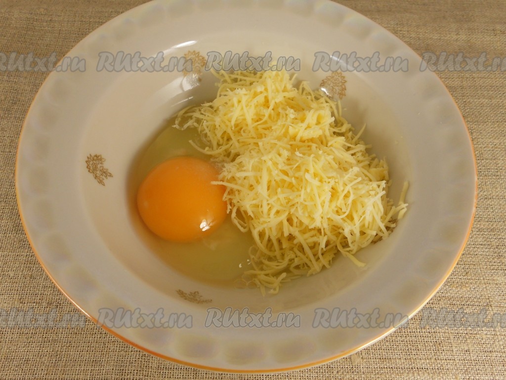 Пока варится овощной суп, замесим тесто для сырных клёцек. Для этого в глубокой тарелке нужно соединить сырое яйцо и сыр, натёртый на мелкой тёрке, немного посолить.