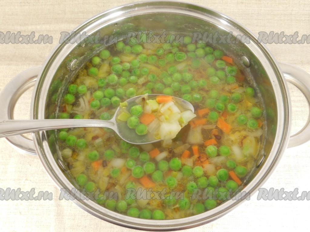 Сразу же добавить обжаренные овощи, дать закипеть, после этого варить суп на небольшом огне 7 минут.