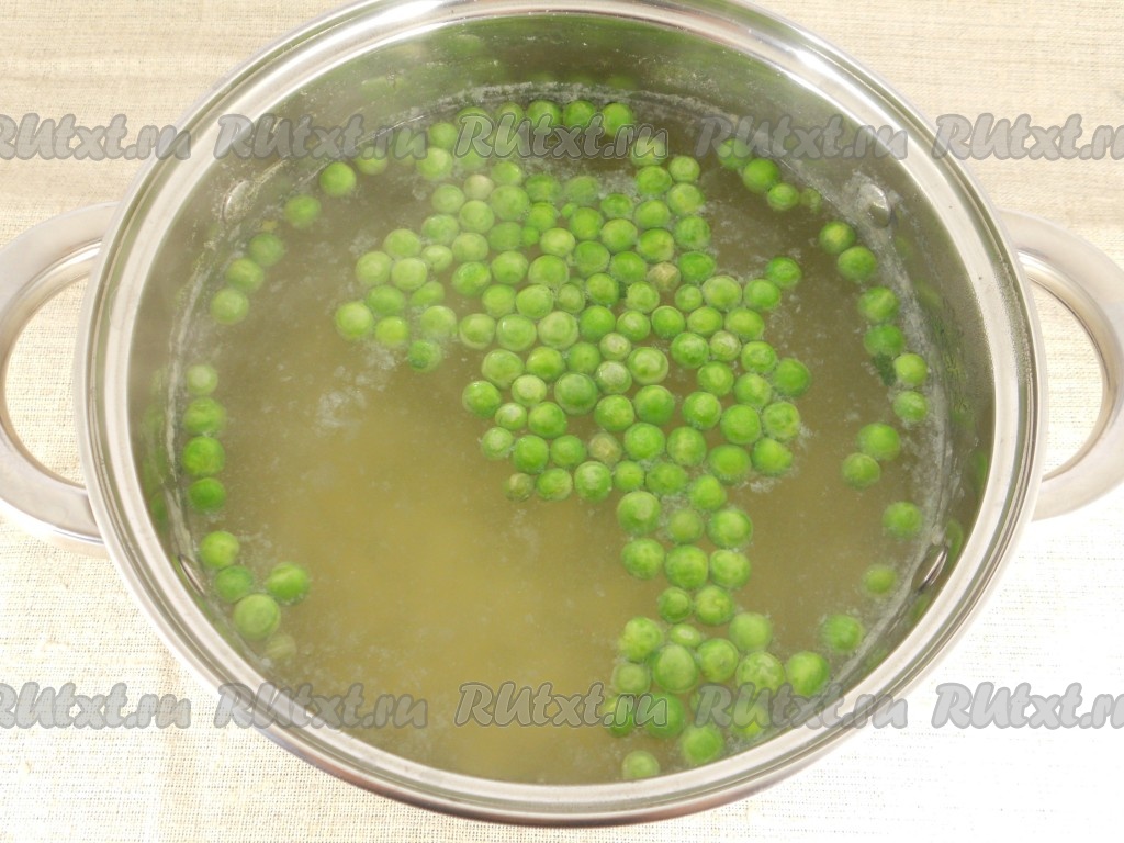 Пока варится картошка, нарезать морковь на небольшие кубики (или натереть на крупной тёрке). Лук мелко нарезать. Разогреть растительное масло в сковороде, выложить лук и морковь, обжарить их на среднем огне, периодически перемешивая, в течение 6-7 минут (до мягкости морковки). После того как картошка с момента закипания проварится 15 минут, выложить в кастрюлю замороженный горошек.