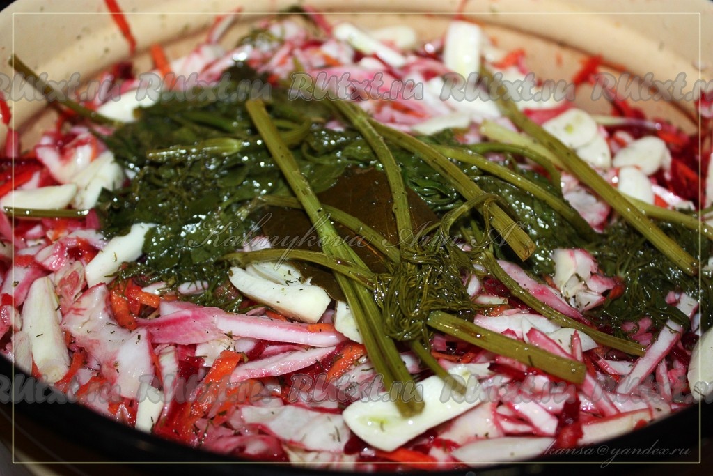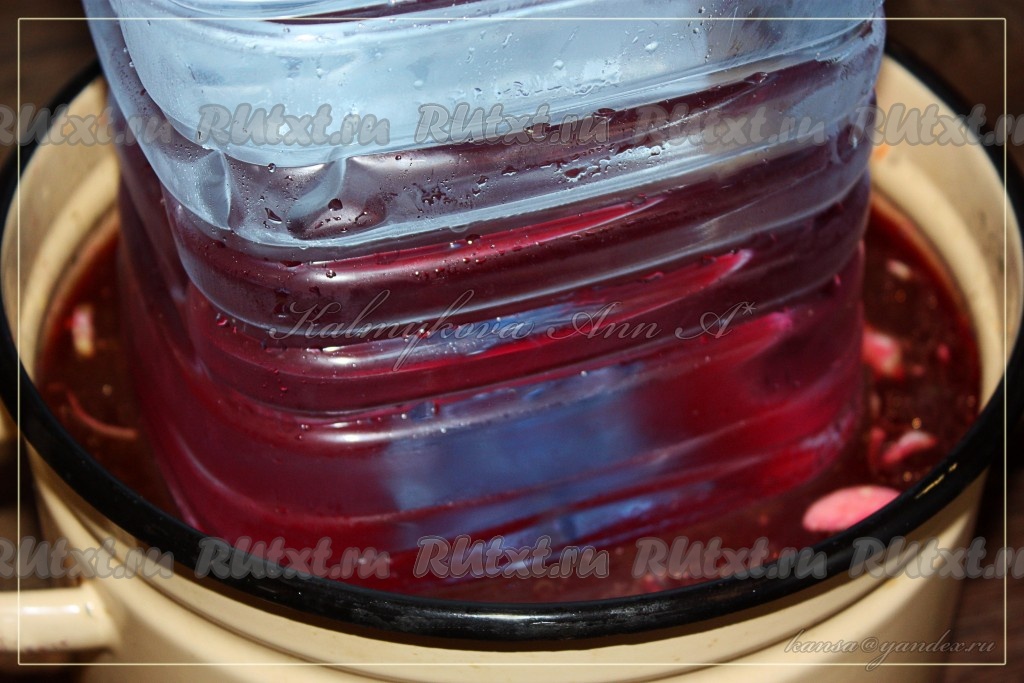 Убрать под груз (груза весом 3-5 кг вполне хватит) в прохладное место на 12-15 часов. Далее хранить в холодильнике. Через сутки наивкуснейшая капуста будет готова.