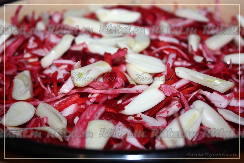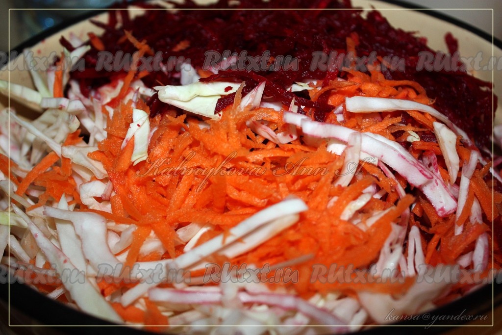 Нашинковать капусту, морковку и свеклу натереть на терке.