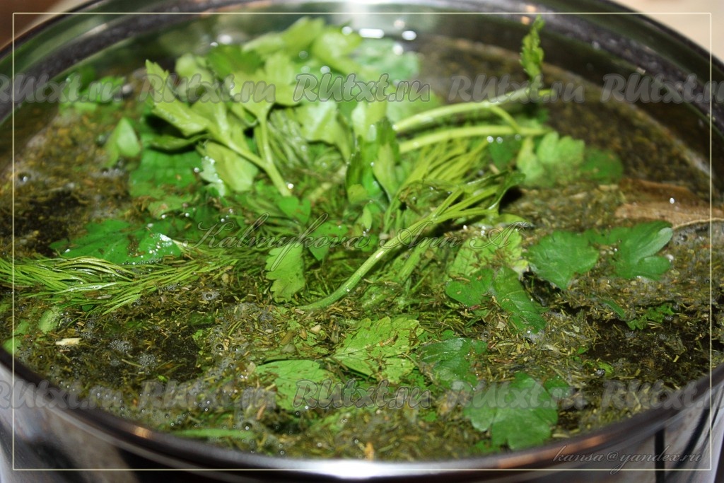 Приготовить рассол: воду довести до кипения, добавить уксус, масло растительное, специи, соль, сахар, зелень. Прокипятить минуту.