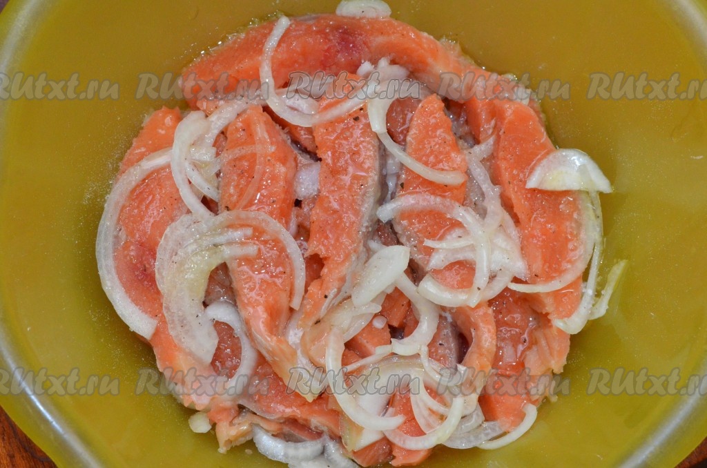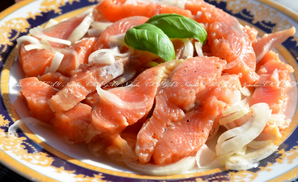 Горбуша, солёная кусочками с луком и маслом, готова. Очень надеюсь, что вы оцените этот рецепт приготовления слабосолёной красной рыбы.