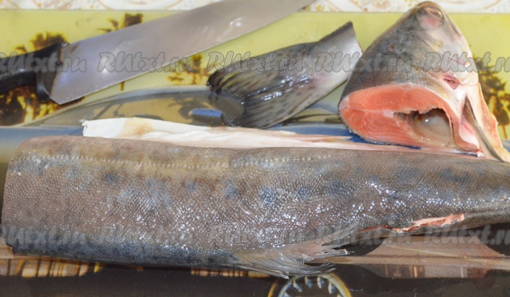 Горбуша обычно продаётся в замороженном виде, так что первым делом её следует разморозить. Я советую полностью не размораживать, чтобы рыба уже могла резаться ножом, но при этом мякоть была подмороженная (не мягкая). Горбушу моем, отрезаем голову, плавники, хвост. Разрезаем брюшко, хорошо промываем внутри, чтобы удалить чёрную плёнку.