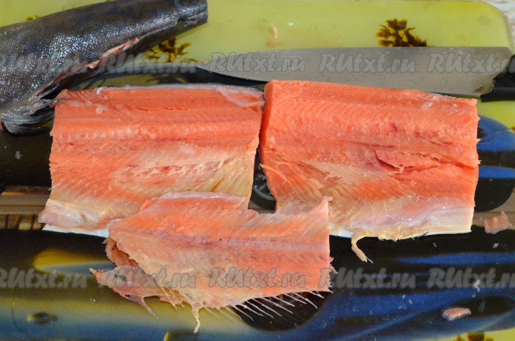 После этого разрезаем филе горбуши на кусочки, как на фото.