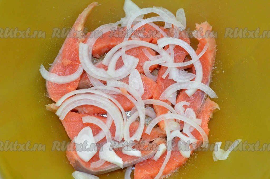 Продолжаем укладывать кусочки горбуши и лук слоями, не забывая пересыпать смесью соли и сахара. В конце заливаем растительным маслом (можно ароматным), перемешиваем, накрываем миску и убираем в холодильник на 4 часа или более.