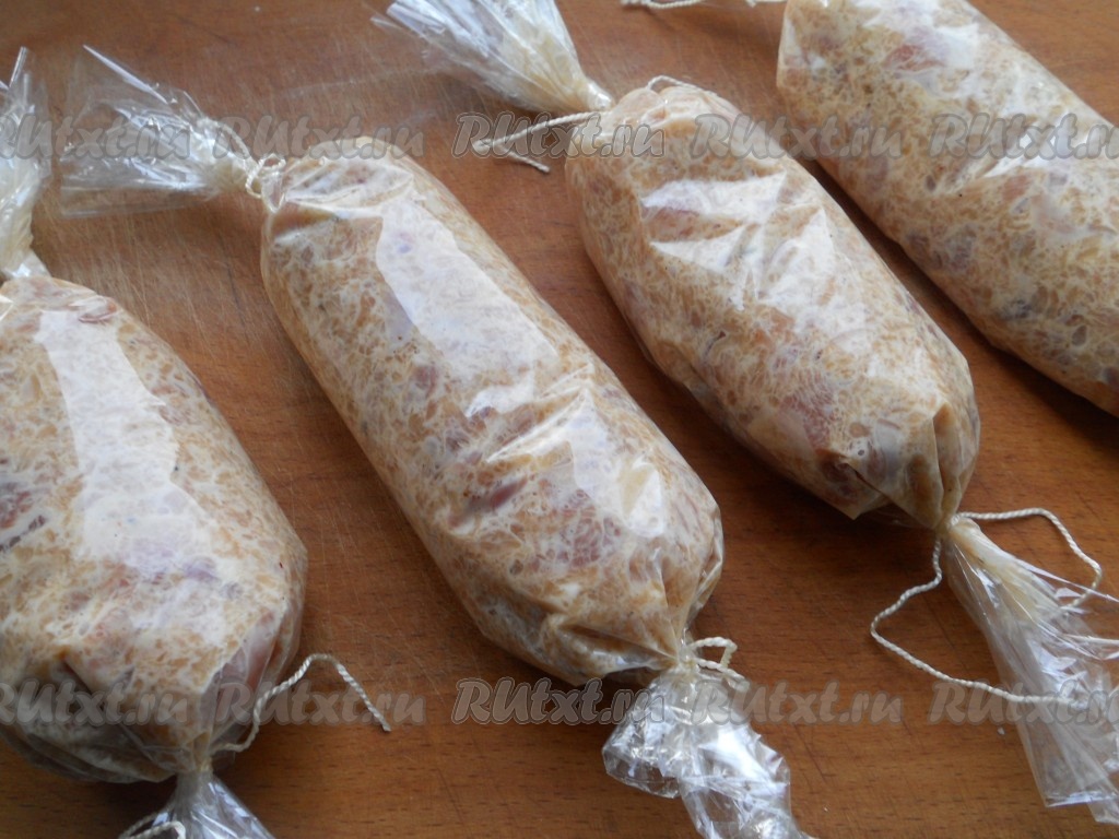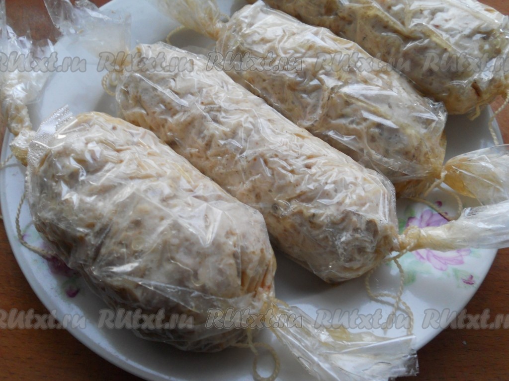 Готовить домашние куриные колбаски на пару или варить в воде около 1 часа.